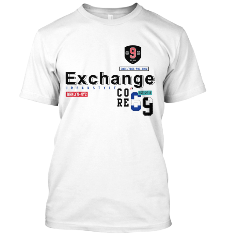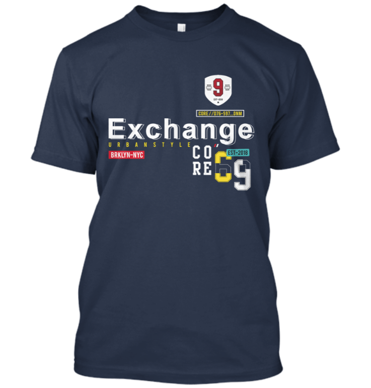 T-shirt de qualité décoré d’une impression colorée « Exchange ». Disponible en marine et en blanc.