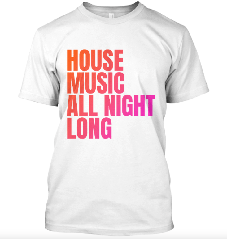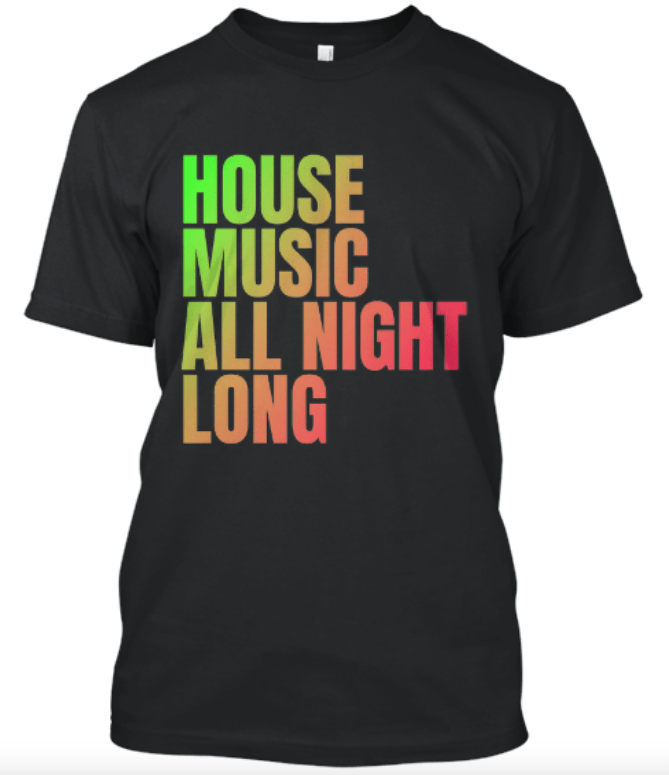 T-shirt de qualité décoré d’un imprimé coloré « House Music All Night Long ». Disponible en noir ou en blanc.