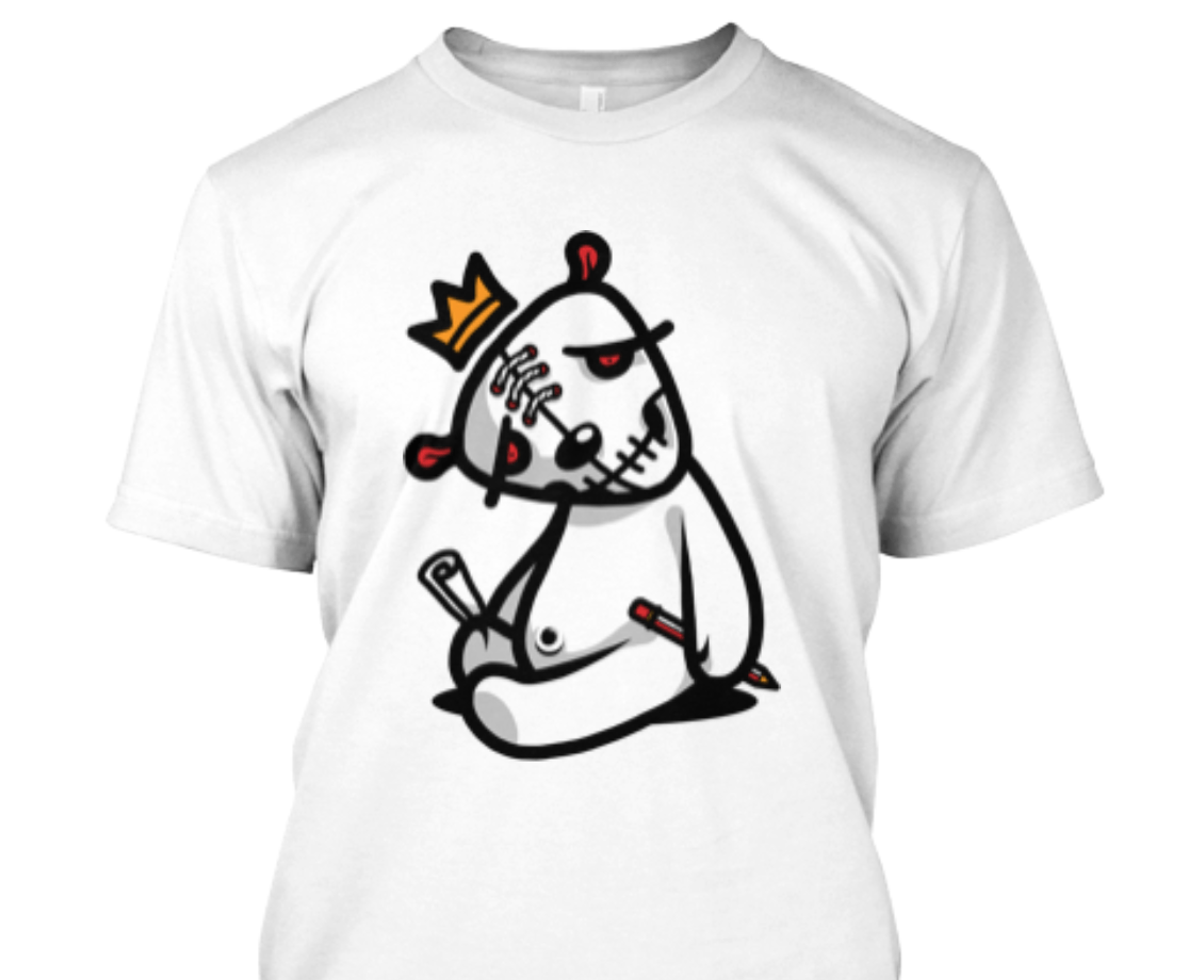 T-shirt de qualité décoré d’un ours endommagé coloré. Disponible en blanc.