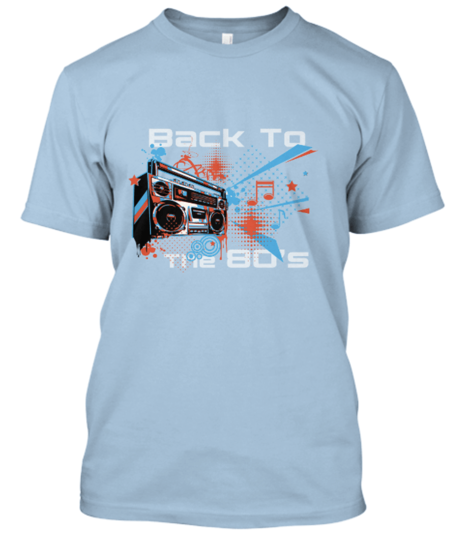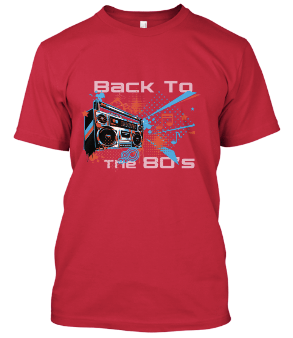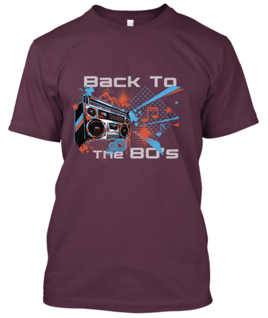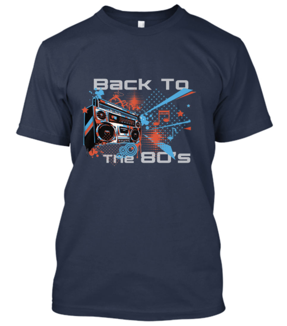 Un tee-shirt avec un boombox, retour aux années 80. Disponible en 7 couleurs. Bleu royal, bleu marine, brun chocolat, marron, rouge, bleu clair et noir