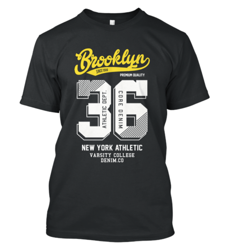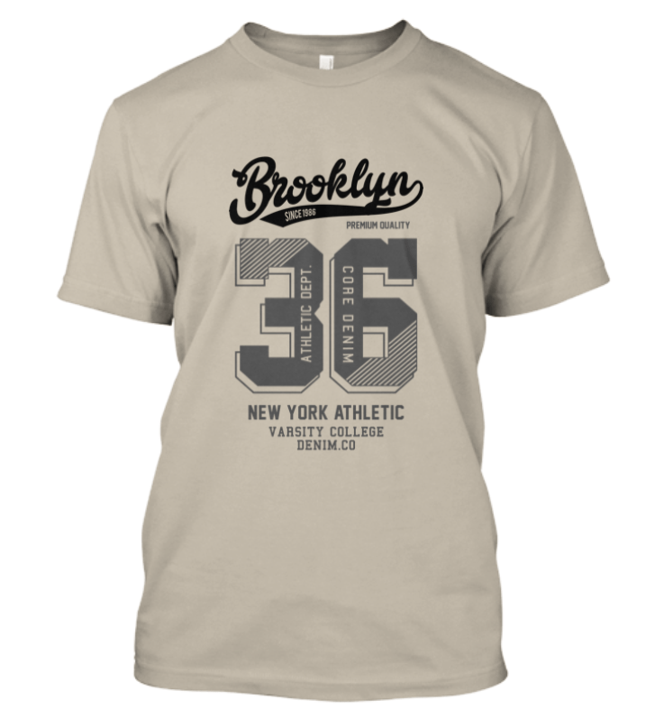Quality T-shirt decorated with a colourful imprint ‘Brooklyn 36 New York Athletic’. Available in black and sand.