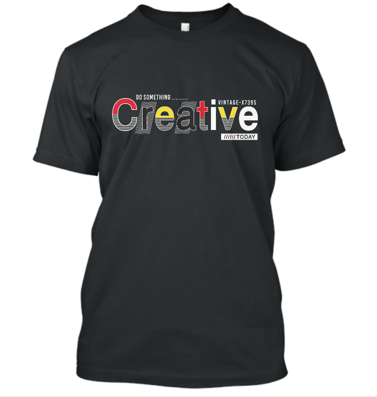 Quality T-shirt decorated with a colourful imprint ‘Creative’. Available in black
