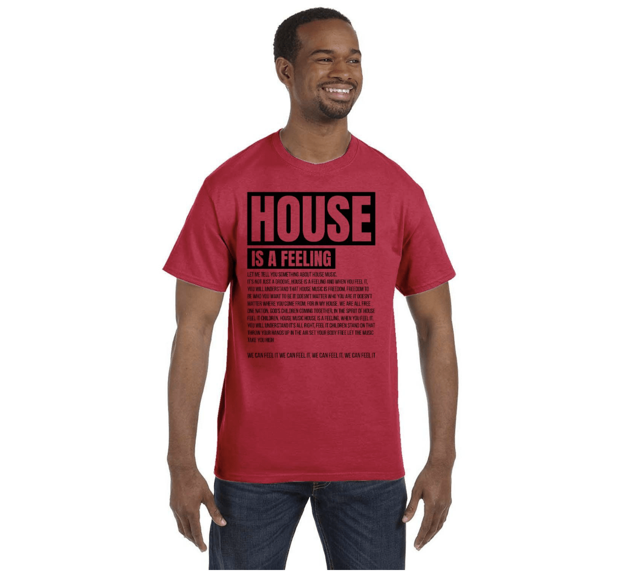 The lyrics of the famous House Is A Feeling house classic on a T. One of a kind! Available in True Red, Royal Blue, White, Black and Black Heather